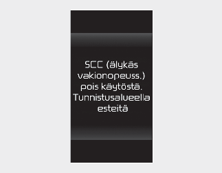 Jos näin tapahtuu, älykäs vakionopeussäädin sammutettu. Tutka estetty” tai (”SCC (”Älykäs vakionopeussäädin) pois käytöstä. Tutka estetty”) varoitusviesti, ja varoitusvalo tulee näkyviin mittaristoon.