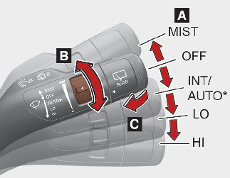 INT / ---: El limpiaparabrisas opera de forma intermitente a los mismos intervalos de barrido. Utilice este modo para poca lluvia o niebla. Para variar el ajuste de velocidad, gire el mando de control de la velocidad.