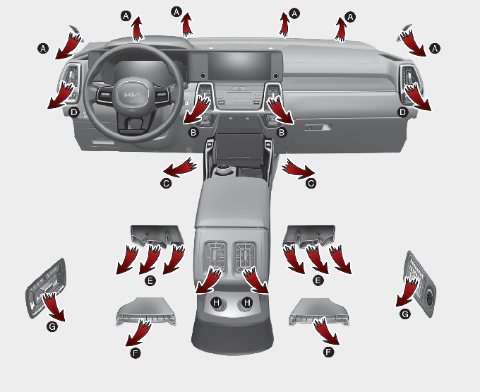 Mientras la mayor parte del aire se dirige hacia el suelo y hacia el parabrisas, una cantidad menor se dirige hacia los desescarchadores de las ventanillas laterales y las salidas de aire laterales.
