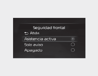 • Si selecciona "Asistencia activa", la función avisará al conductor con un mensaje de advertencia, un sonido de advertencia y la vibración del volante dependiendo del nivel de riesgo de colisión. Se aplicará asistencia al freno según el riesgo de colisión.