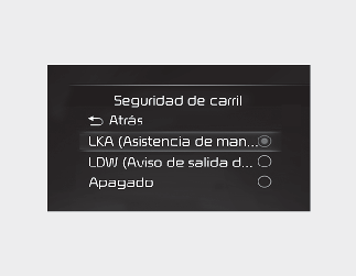 Si selecciona "Lane Keeping Assist" (Asistencia mant. carril), la función proporcionará automáticamente la asistencia a la dirección del conductor cuando se detecte la salida del carril para evitar que el vehículo se salga de su carril.