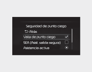 Con el botón ENGINE START/STOP (inicio/parada del motor) en la posición ON (activado), seleccione "Driver Assistance (Asistencia al conductor) → Blind-Spot Safety (Seguridad de punto ciego) → Blind Spot View (Vista de punto ciego)" en el menú Ajustes para activar el monitor de vista de punto ciego y cancele la selección para desactivar la función.