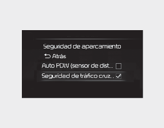 Con el botón ENGINE START/STOP (inicio/parada del motor) en la posición ON (activado), seleccione "Driver Assistance (Asistencia al conductor) → Parking Safety (Seguridad de aparcamiento) → Rear Cross-Traffic Safety (Seguridad de tráfico cruzado trasero)" en el menú Ajustes para activar la asistencia de prevención de colisión con tráfico cruzado trasero y cancele la selección para desactivar la función.