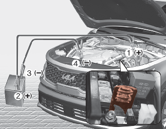 Conecte un extremo del cable de puente al terminal negativo de la batería de refuerzo (3) y conecte el otro extremo a un punto sólido, estable y metálico alejado de la batería (4).