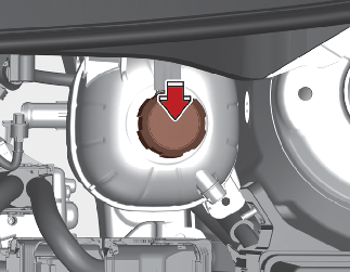 1. Compruebe que la etiqueta del tapón del depósito de refrigerante del motor esté delante.
