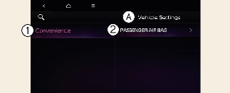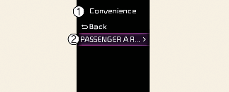 Kad automobilis iedarbināts, instrumentu panelī pieskarieties Iestatījumi → Ērtība → PASAŽIERA GAISA SPILVENS vai informācijas un izklaides sistēmas ekrānā Iestatījumi → Automobilis → Ērtība → PASAŽIERA GAISA SPILVENS.