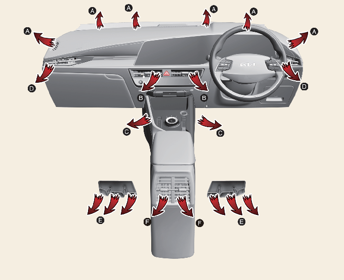 Lielākā gaisa plūsmas daļa tiek virzīta uz grīdu, neliela gaisa plūsmas daļa tiek novirzīta uz priekšējo vējstiklu, sānu logu atkausētājiem un sānu gaisa atverēm. |