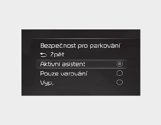 Je-li tlačítko ENGINE START/STOP (Nastartování/vypnutí motoru) v poloze ON (Zapnuto), můžete výběrem jednotlivých voleb „Driver Assistance → Parking Safety“ (Jízdní asistenti → Bezpečné parkování) v nabídce Settings (Nastavení) určit, zda má či nemá být používána určitá funkce.