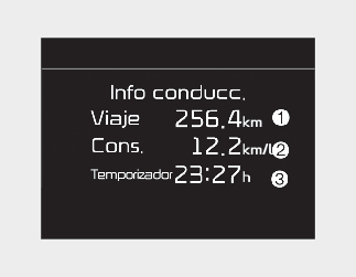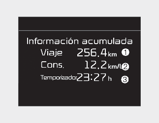 Muestra la información acerca de la distancia del recorrido (1), el consumo medio de combustible (2) y el tiempo total de conducción (3) una vez por ciclo de encendido.