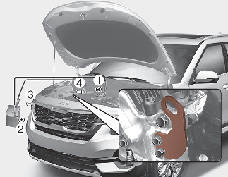 Conecte el otro extremo de la pinza al terminal negativo de la batería de refuerzo (3) y pince el otro extremo a un punto sólido, estable y metálico alejado de la batería (4) (por ejemplo, el soporte de elevación del motor). No lo conecte a o cerca una pieza que se mueva cuando el motor se pone en marcha.