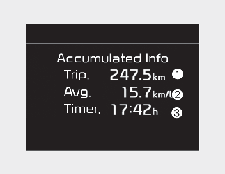 This display shows the trip distance (1), the average fuel efficiency (2), and the total driving time (3) information once per one ignition cycle.