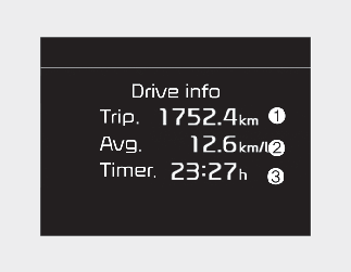 This display shows the trip distance (1), average fuel economy (2), driving time (3).