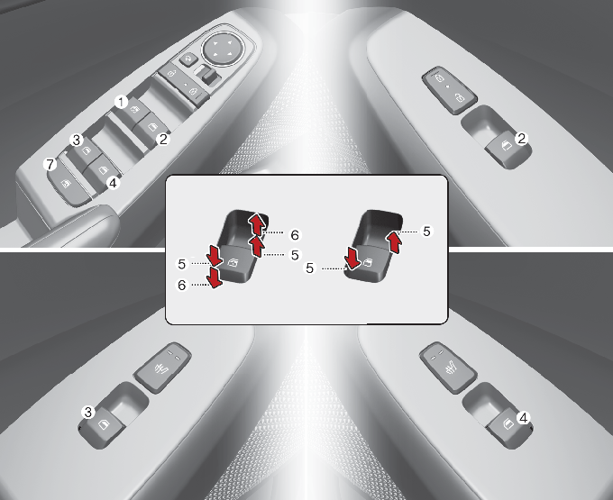 Each door has a power window switch that controls the door's window. The driver has a power window lock button which can block the operation of rear passenger windows. The power windows can be operated for approximately 10 minutes after the ignition key is removed or turned to the ACC or LOCK position. However, if the front doors are opened, the power windows cannot be operated even within the 10 minutes period.