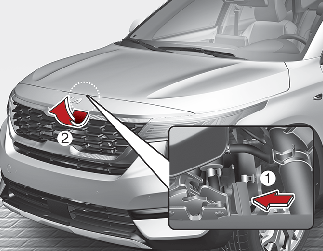 Go to the front of the vehicle, raise the hood slightly, push the secondary latch (1) up side and lift the hood (2).