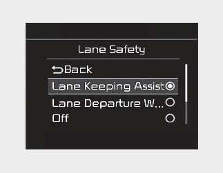 The driver can change Lane Keeping Assist to Lane Departure Warning or change Lane Keeping Assist mode from the LCD display or infotainment function display. Go to the 'User Settings → Driver Assistance → Lane Safety → Lane Keeping Assist/Lane Departure Warning/Off'.