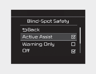 Blind-Spot Collision-Avoidance Assist and Blind-Spot Collision Warning turn on and get ready to be activated when 'Active assist' is selected. Then, if a vehicle approaches the driver's blind spot area a warning sounds or braking power is applied.