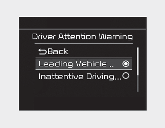 The driver can select the initial warning activation time in the User Settings in the LCD display or infotainment function display by selecting 'User Settings → Driver Assistance → Warning Timing'. The options for the initial Inattentive Driving Warning includes the following: