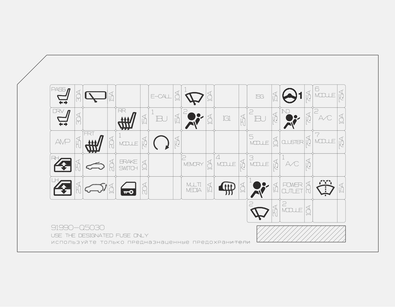 ICU Junction Block (Fuse Name - P/SEAT (PASS), P/SEAT (DRV), AMP, P/WDW RH, P/WDW LH, S/HEATER FRT, SUNROOF, TAIL GATE OPEN) |