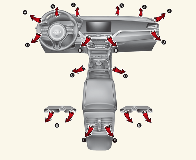 Most of the air flow is directed to the floor, with a small amount of air directed to the windshield, side-window defrosters, and side air vents. |