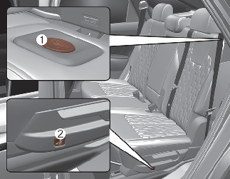 Press the switch (1) on the top of the 2nd row seat or press the switch (2) on the bottom of the 2nd row seat to unlock.