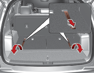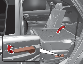 Pull on the seatback folding lever (for 2nd row) or strap (for 3rd row), then fold the seat toward the front of the vehicle. When you return the seatback to its upright position, always be sure it has locked into position by pushing on the top of the seatback.