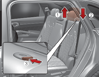 To raise the headrest, pull it up to the desired position (1). To lower the headrest, push and hold the release button (3) on the headrest support and lower the headrest to the desired position (2).