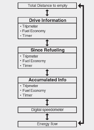 This display shows the trip distance (1), the average fuel efficiency (2), and the instant fuel economy (3), and the total driving time (4) information once per one ignition cycle.
