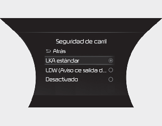 Si selecciona "Asistencia (pantalla LCD) o Asistencia (pantalla del sistema de infoentretenimiento)", la función activará automáticamente la asistencia a la dirección del conductor cuando se detecte la salida de carril para evitar que el vehículo se salga de su carril.