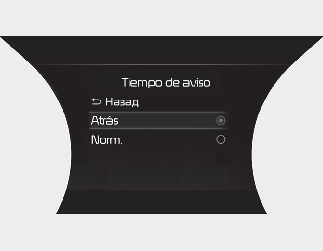 El conductor puede seleccionar el tiempo de activación de la advertencia inicial en Ajustes Usuario en la pantalla LCD mediante la selección de "Ajustes Usuario (pantalla LCD) o Ajustes → Vehículo (pantalla del sistema de infoentretenimiento) → Asistencia al conductor → Tiempo de aviso". Cuando se entrega el vehículo, el tiempo de aviso tiene el valor "Normal" (Normal). Si modifica el tiempo de aviso, es posible que cambie el tiempo del tiempo de aviso de otras funciones de asistencia al conductor. Compruebe el tiempo de activación de la advertencia antes de cambiarlo.