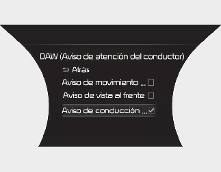 El aviso de atención del conductor se ha configurado para que esté en la posición OFF (desactivado), cuando se le entregue el vehículo de fábrica por primera vez.