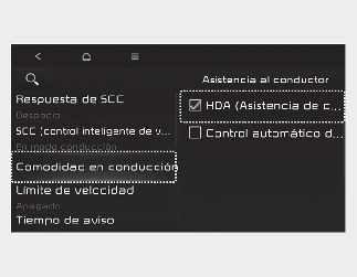 "Asistencia al conductor → Conveniencia de conducción → Control de velocidad automático en autopista (pantalla LCD) o Cambio de velocidad automático en autopista (pantalla del sistema de infoentretenimiento)" en "Ajustes Usuario (pantalla LCD) o Ajustes → Vehículo (pantalla del sistema de infoentretenimiento)" para activar el control de crucero inteligente basado en la navegación y cancele la selección para desactivar la función.