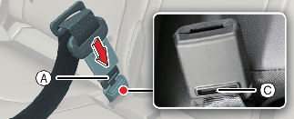 За да приберете задния централен предпазен колан, поставете пластината на езика или подобно малко твърдо устройство в отвора за освобождаване на паяжината (C). Издърпайте нагоре лентата на предпазния колан (A) и оставете лентата да се прибере автоматично.
