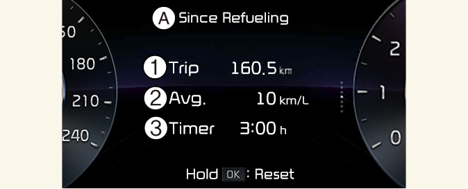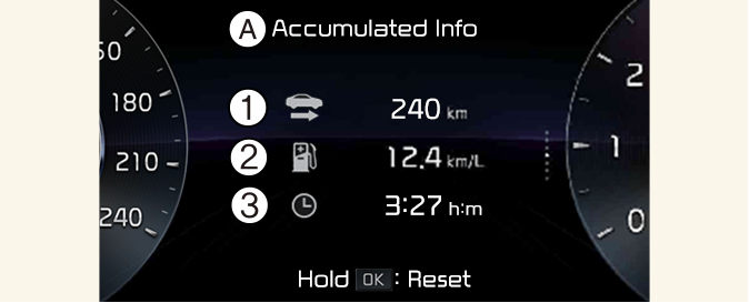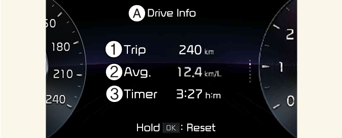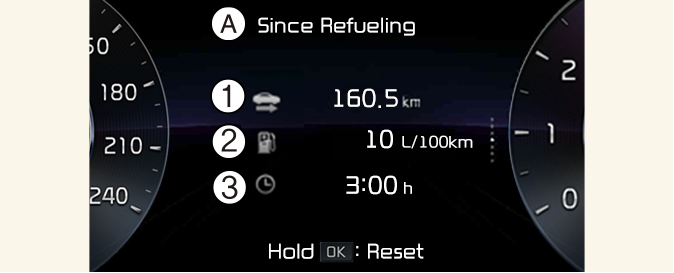 Ръчно: Натиснете и задръжте бутона OK на волана докато се покаже средната икономия на гориво.