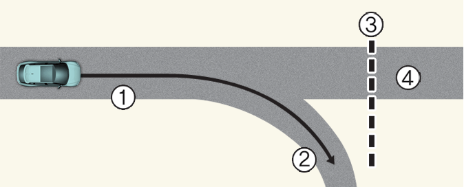 [1]: Маршрут на движение, [2]: Лента за отклонение, [3]: Участък на пътя със завой, [4]: Главен път