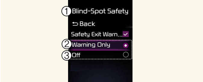 Ако функцията „Безопасност по отношение на мъртвата зона“ се включи (изберете, с изключение на функцията „Изключено “), когато двигателят бъде стартиран отново, външното огледало за обратно виждане ще мига в продължение на 3 секунди. Това означава, че функцията работи.