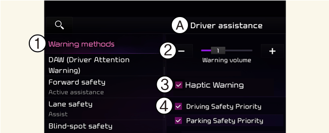 В зависимост от вашия регион или версия на софтуера на инфотейнмънт системата, менюто може да се покаже като Сила на звука на предупрежденията, Предупредителен звук и предупреждение с вибрация или Методи за предупреждение.
