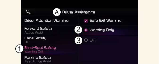 Когато двигателят е включен, на арматурното табло докоснете Потребителски настройки → Помощ за водача → Безопасност по отношение на мъртвата зона , или изберете Настройки → Автомобил → Помощ за водача → Безопасност по отношение на мъртвата зона на екрана на инфотейнмънт системата, за да зададете дали да използвате или не всяка функция.