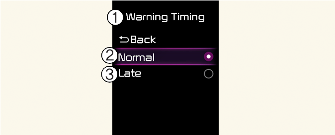 Ако автомобилът бъде стартиран отново, ще бъде запазена последната настройка на времето за предупреждение.