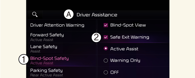 Когато автомобилът работи, изберете Потребителски настройки → Помощ за водача → Безопасност на мъртвата зона → Предупреждение за безопасно излизане на арматурното табло или настройки → автомобил → Помощ за водача → Безопасност на мъртвата зона → Предупреждение за безопасно излизане.