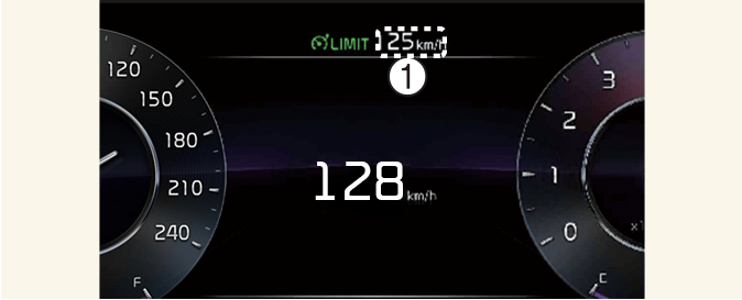 Зададеното ограничение на скоростта (1) ще се показва на арматурното табло. Ако искате да увеличите скоростта над предварително зададеното ограничение, натиснете педала на газта отвъд точката на съпротивление, за да активирате механизма на ускоряване. Зададеното ограничение на скоростта ще примигва и ще звучи звуково предупреждение, докато не върнете скоростта в рамките на ограничението.