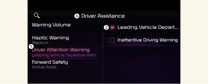 Когато автомобилът е включен, изберете Потребителски настройки → Помощ за водача → Предупреждение за разсейване на водача на арматурното табло или изберете Настройки → Автомобил → Помощ за водача → Предупреждение за разсейване на водача в инфотейнмънт системата, за да настроите дали да се използва или не всяка функция.