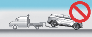 Автомобилът трябва да се тегли само на колесари или автомобили за репатриране, като нито едно колело не трябва да опира в пътя.