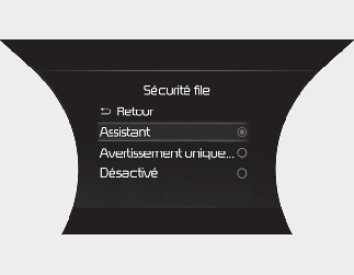 Si ‘Assist’ (« Assistant ») est sélectionné, l'assistance au maintien de la voie assiste automatiquement le conducteur si un changement de voie est détecté afin d'éviter que le véhicule ne s'écarte de sa voie.