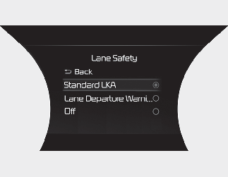 If ‘Standard LKA (LCD display) or Assist (Infotainment System screen)’ is selected, the function will automatically assist the driver’s steering when lane departure is detected to help prevent the vehicle from moving out of its lane.