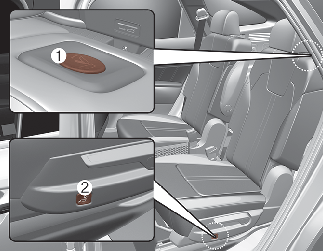 Appuyez sur le commutateur (1) sur le dessus du siège de la 2e rangée ou appuyez sur le commutateur (2) sur le bas du siège de la 2e rangée pour déverrouiller.