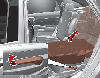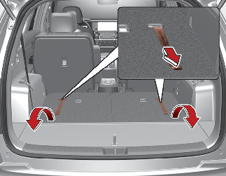 Le commutateur de rabattage de siège de la 2e rangée est situé sur le côté droit du siège de la 3e rangée. Le siège de la 2e rangée sera rabattu. Si vous appuyez sur le commutateur de gauche, le siège de gauche et celui au centre se rabattront. Si vous appuyez sur le commutateur de droit, le siège de droite se rabattra.