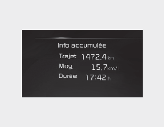 Cet affichage indique la distance du trajet cumulée, le rendement moyen du carburant et la durée totale du trajet.