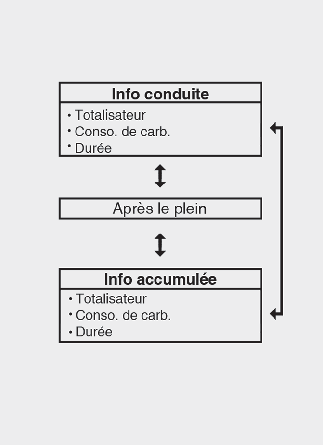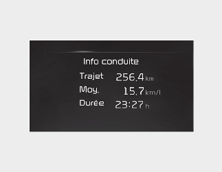 Cet affichage affiche la distance parcourue, le rendement énergétique moyen et le rendement énergétique instantané (ou la durée totale de conduite) depuis le ravitaillement.