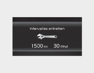 Si le kilométrage ou le temps restant atteint 1500 km (900 mi) ou 30 jours, le message « Service interval » (Intervalle d’entretien) s'affiche pendant quelques secondes à chaque fois que vous mettez le bouton ENGINE START/STOP (démarrage/arrêt du moteur) sur la position ON (marche).