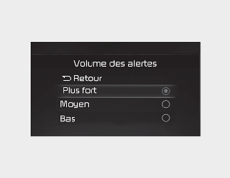 Le commutateur ENGINE START/STOP (démarrage/arrêt du moteur) à la position ON, sélectionnez « Driver Assistance → Warning Volume » (Assistance au conducteur - Volume de l'alerte) dans le menu « Settings » (Paramètres) pour modifier le volume de l’alerte entre « High », « Medium », « Low » ou « Off » pour l’avertissement du système « Forward/Reverse Parking Distance Warning » (Stationnement en marche avant/arrière).